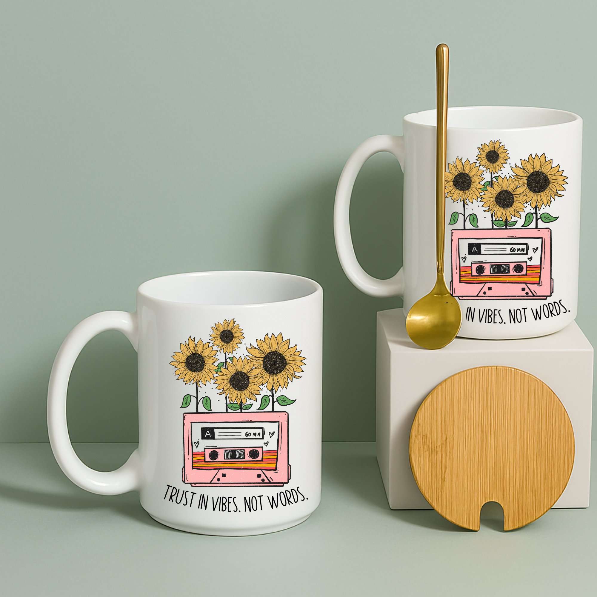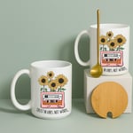 • Design: Retro cassette + sunflower artwork on white ceramic